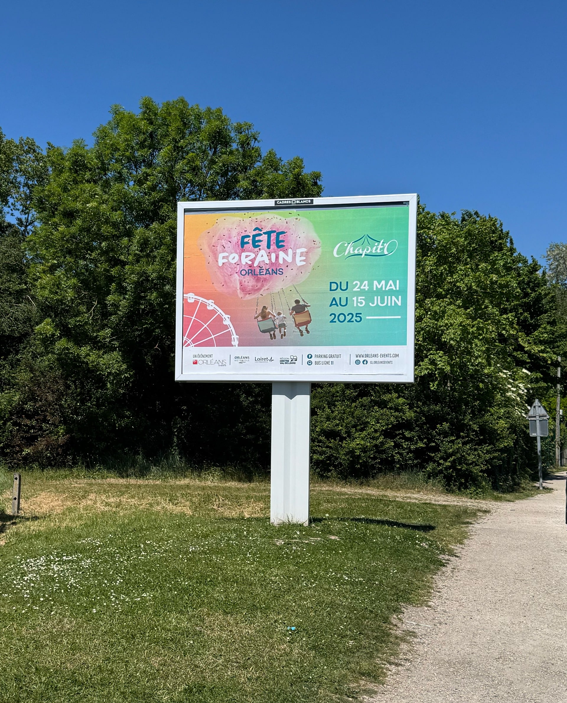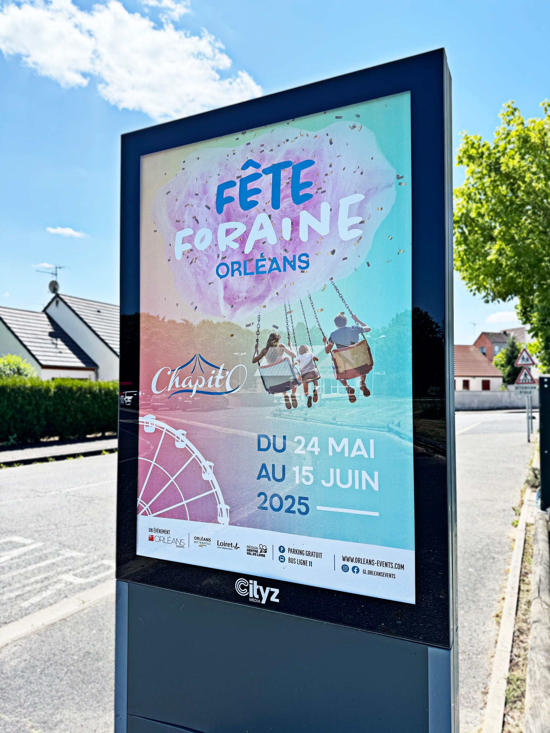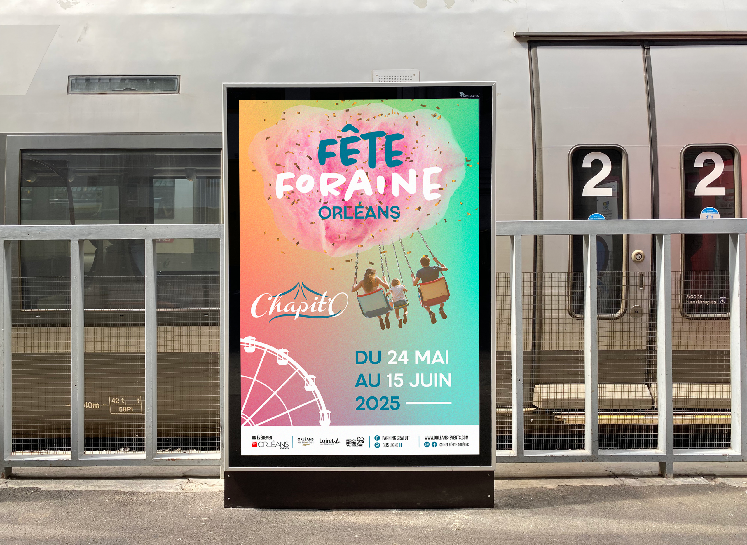 Création d’une affiche événementielle pour la fête foraine d’Orléans : un photomontage créatif où la barbe à papa devient un nuage, symbole de rêve et de légèreté. Une illustration originale et gourmande pour un visuel percutant, pensé pour capter l’attention du public.