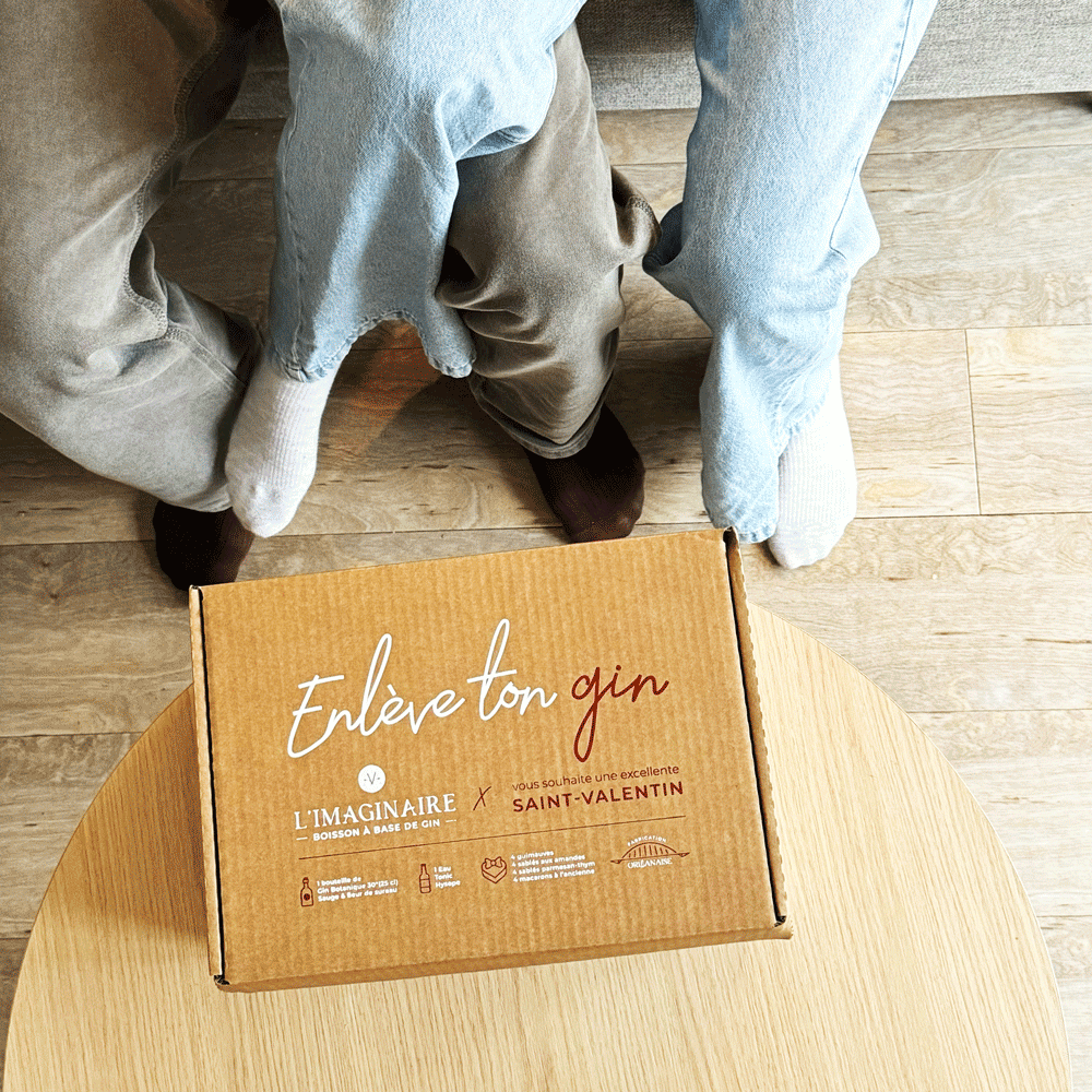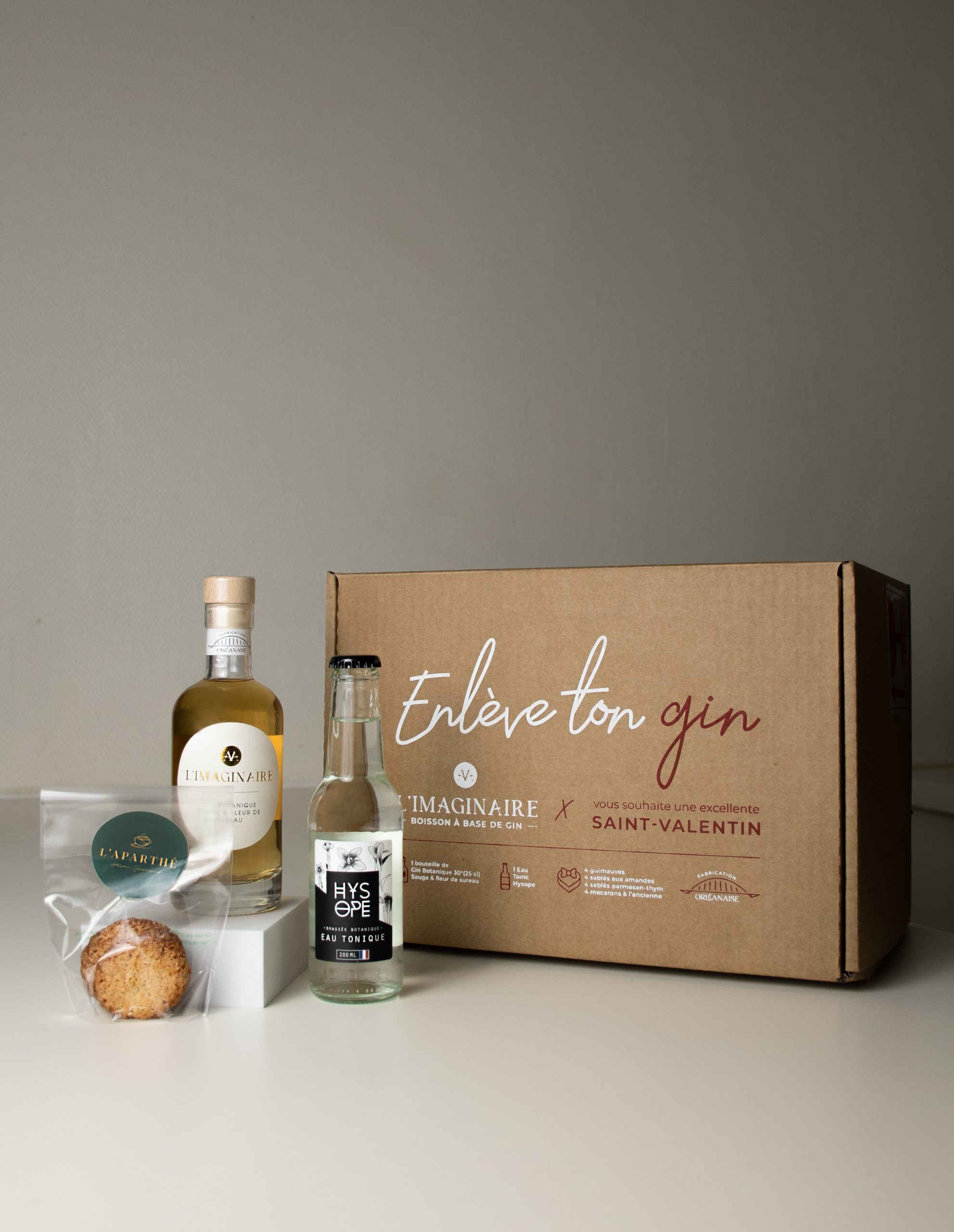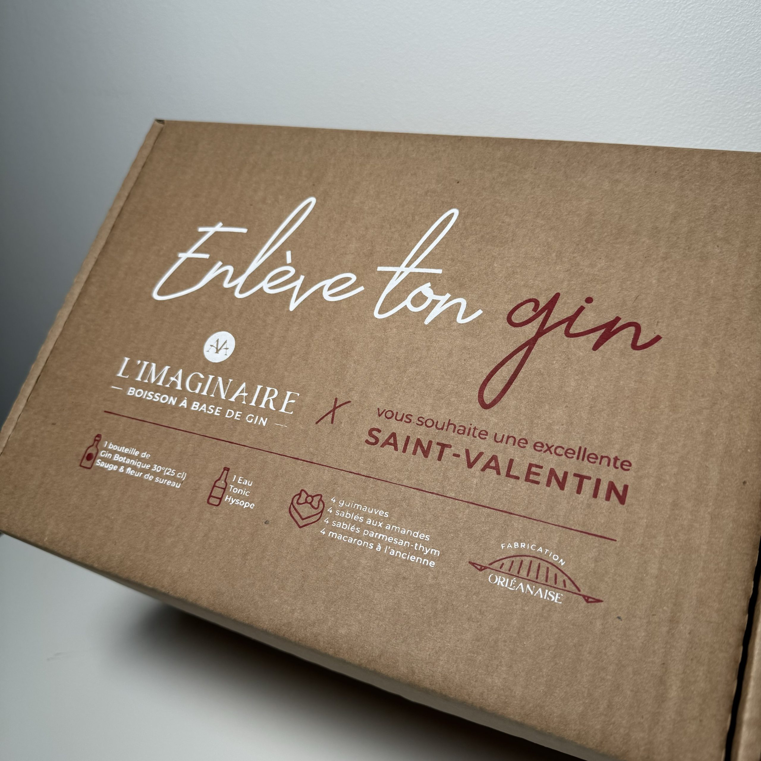 À l’occasion de la Saint-Valentin, nous avons conçu un coffret cadeau original pour L’Imaginaire, producteur de gin arrangé. Le packaging comprend une bouteille, un tonic, des douceurs et un jeu exclusif. Le coffret, imprimé en sérigraphie avec Atelier Pomme, allie design élégant et expérience sensorielle. Une création unique pensée pour séduire les amateurs de spiritueux et les amoureux.