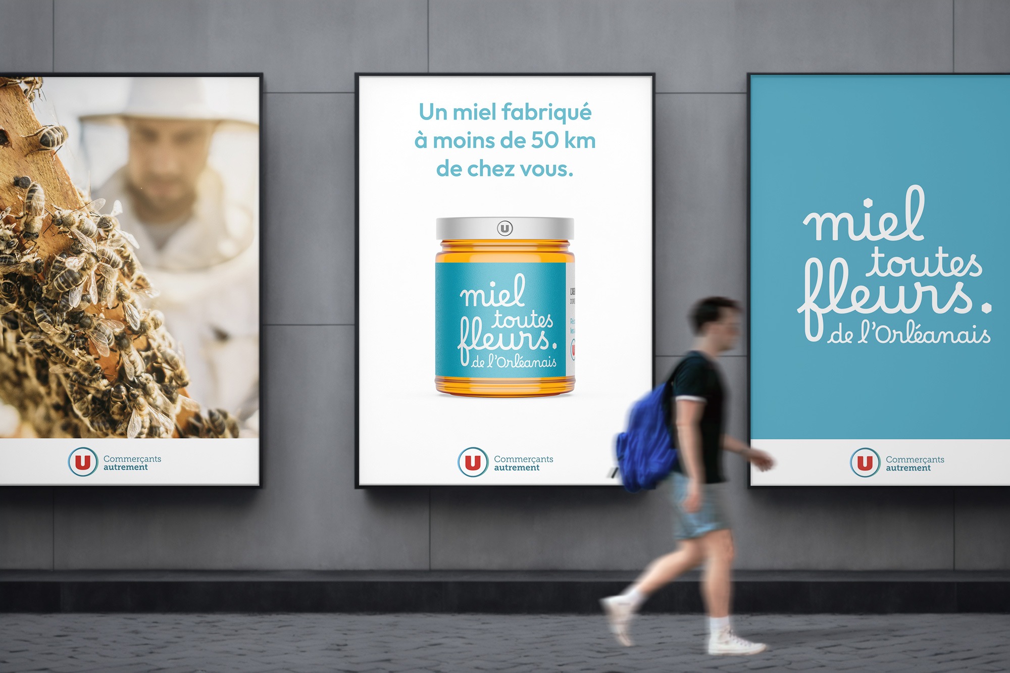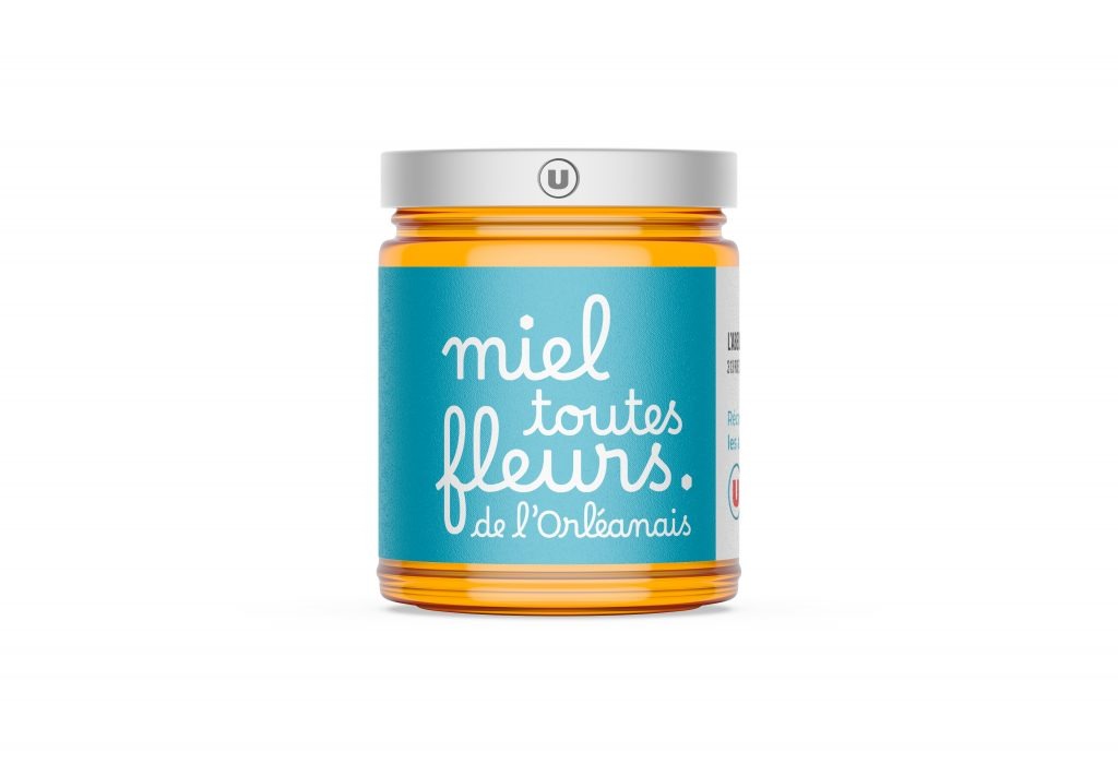 Conception graphique d’une étiquette de pot de miel pour les magasins Super U du Centre-Val de Loire, en partenariat avec L’Abeille Olivetaine, apiculteurs locaux basés à Olivet. Le design joue sur un contraste moderne et naturel : une typographie manuscrite douce et lisible pour évoquer l’authenticité du miel « toutes fleurs », associée à des éléments visuels structurants pour répondre aux exigences de la grande distribution. La palette de couleurs fraîches apporte une touche régionale tout en restant dynamique et facilement identifiable en rayon. Un packaging local et responsable, pensé pour valoriser la production artisanale tout en respectant les standards de lisibilité et d’impact visuel en GMS.